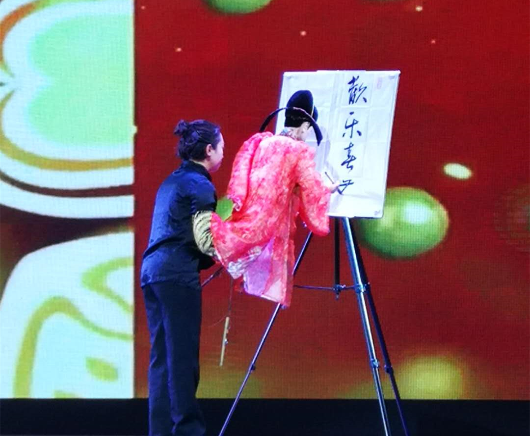 國家級非遺項目江蘇揚州杖頭木偶劇與其他非遺項目結合,創作了木偶劇《變臉》、《書法》。川劇中的“變臉”絕活,移植到木偶上,讓“木偶”代替“活人”進行“絕活”展示,難度可想而知。書法是古代文明文化的象征,木偶書法更是罕見,難度極高,且為左手握筆,對木偶的操作技巧以及操縱者的書畫功底有極高要求。