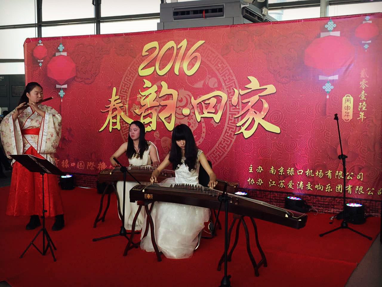 由南京祿口機(jī)場(chǎng)有限公司主辦,江蘇愛(ài)濤交響樂(lè)團(tuán)有限公司協(xié)辦的2016“春韻.回家”新年音樂(lè)巡演,于2月3日上午在國(guó)際交通樞紐中心南京祿口國(guó)際機(jī)場(chǎng)開場(chǎng)演奏,以一曲動(dòng)人的旋律拉開帷幕。即日起,每天上午九點(diǎn)至下午五點(diǎn)黃金時(shí)段,愛(ài)濤交響樂(lè)團(tuán)將演奏10余首中外名曲,為春節(jié)出行的旅客獻(xiàn)上一份濃濃的祝福。