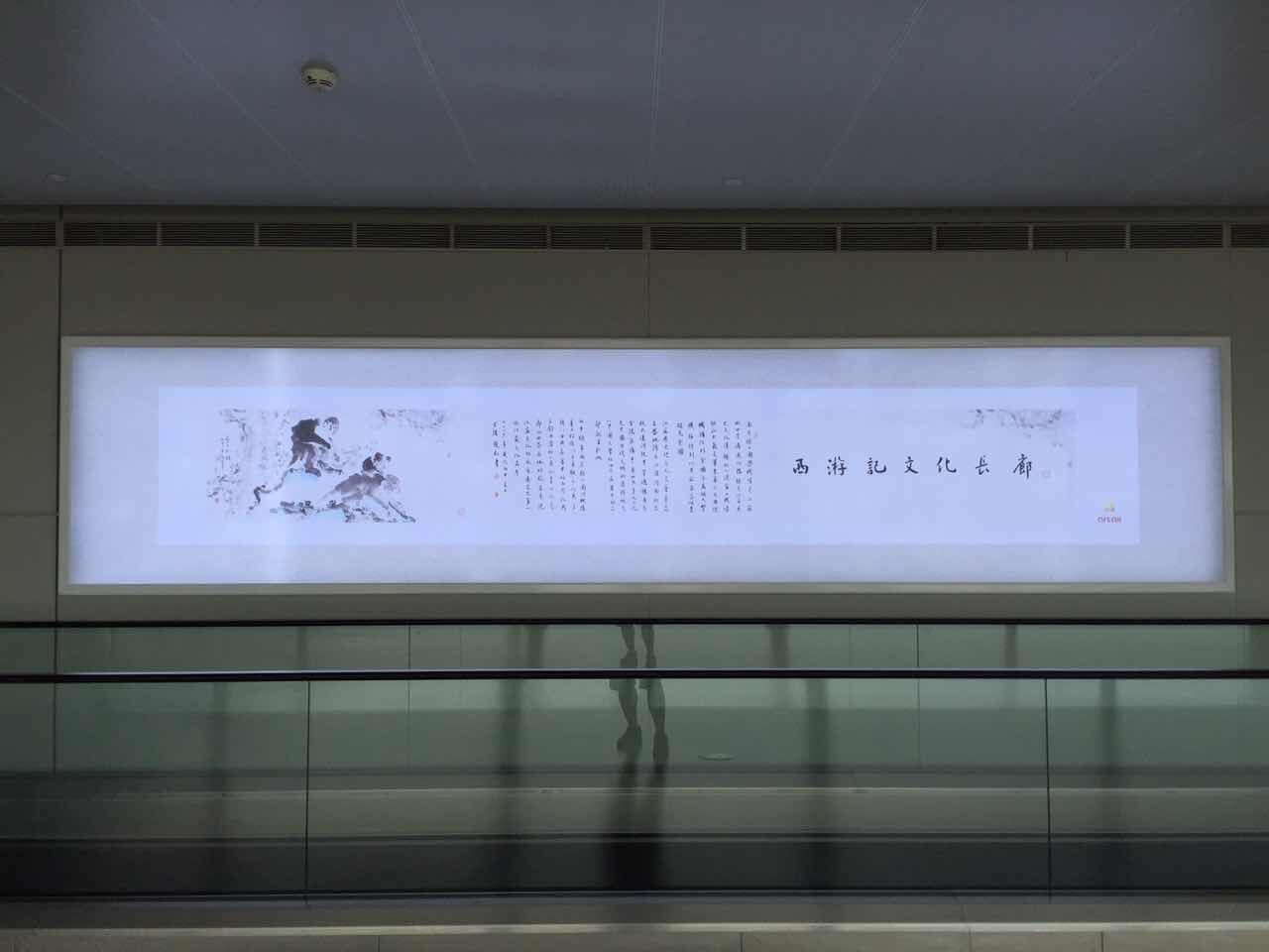 下了飛機(jī)疲憊的倦容適合欣賞一些美景,隨著輕輕的步調(diào),環(huán)顧四周,灰白色的墻上已換上新裝,沒有半點(diǎn)亂花漸欲迷人眼的浮躁感,不驕不躁的水墨情呈現(xiàn)給燈箱是再合適不過的,整個(gè)T2航站樓的長廊儼然開拓了一副新天地,斜陽西照,深色的柱子上一幅幅西游記的經(jīng)典場景回放著映入眼簾,穿過獨(dú)具特色的長廊,陽光透過玻璃墻,照射在灰色的地面上。恢弘大氣的長廊里,有一種內(nèi)斂含蓄的文化底蘊(yùn)在涌動,長廊如紙,柱體如虹,旅客的性情、思緒,融入在造型、筆墨、意蘊(yùn)之中,整個(gè)長廊里流動著平實(shí)敦厚,溫潤超逸的謙謙之音,旅客亦喜焉,似樂也。