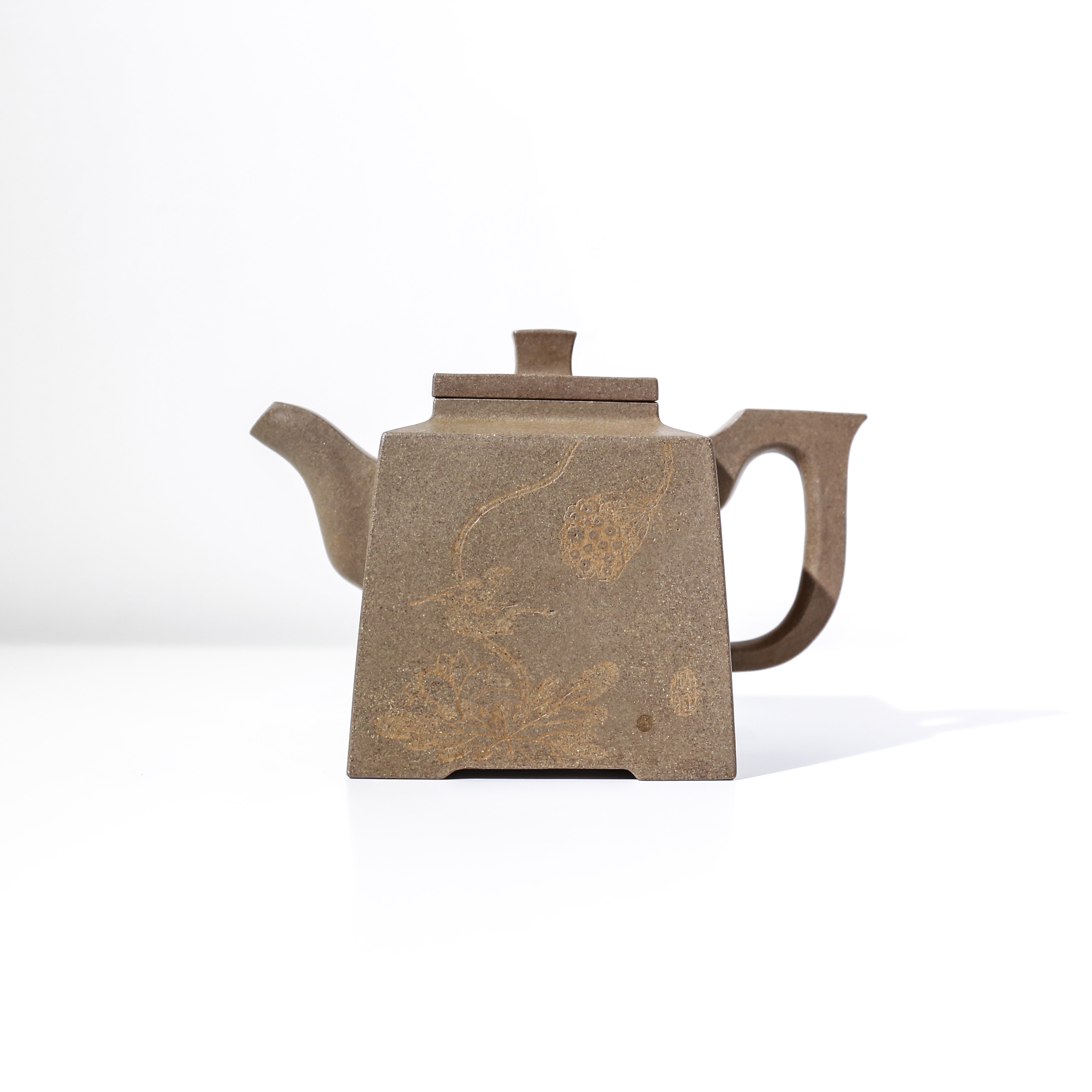 此作品選用了明清磚色泥料,并融入明清時(shí)期的線條感,線條中既有弧度,又不失穩(wěn)重、大氣。壺身一面配有詠荷雅句,另一面刻有一枝若隱若