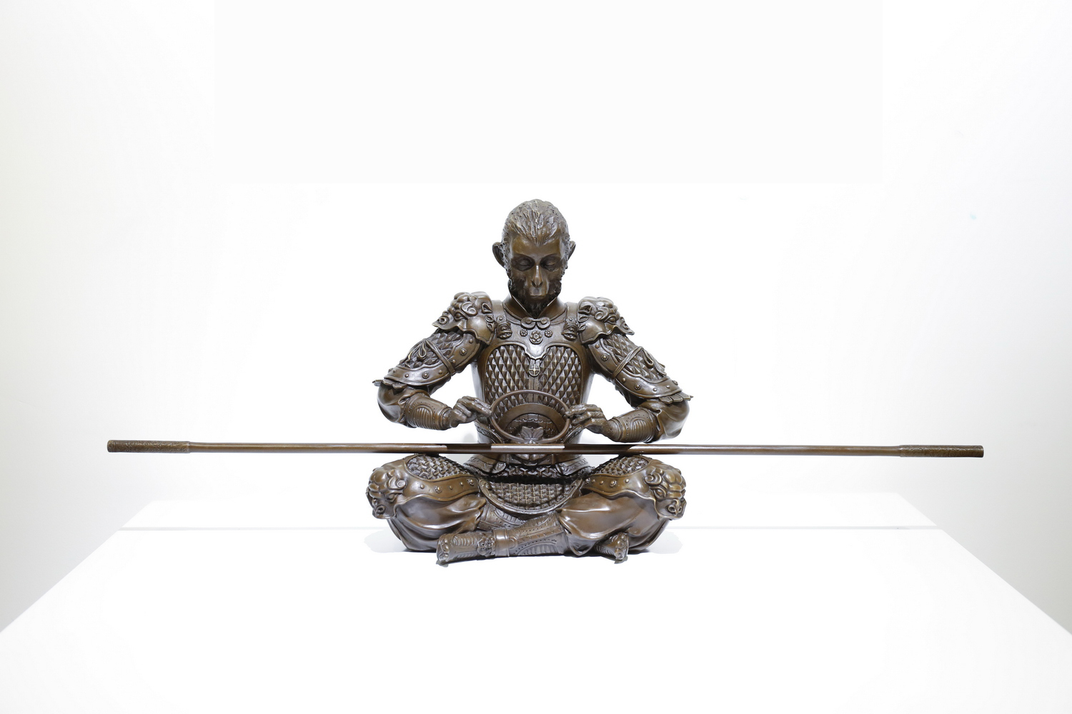 斗戰(zhàn)勝佛重在渲染禪悟思想。創(chuàng)作靈感來(lái)源于張墨一老師原畫和影片大話西游里的經(jīng)典片段,并進(jìn)行了藝術(shù)融合和工藝提煉。制作上把大圣定格在了手持金箍圈欲戴又欲止的心理矛盾中。作品造型舍動(dòng)求靜,然“靜”中更傳遞著取舍間的大悟。