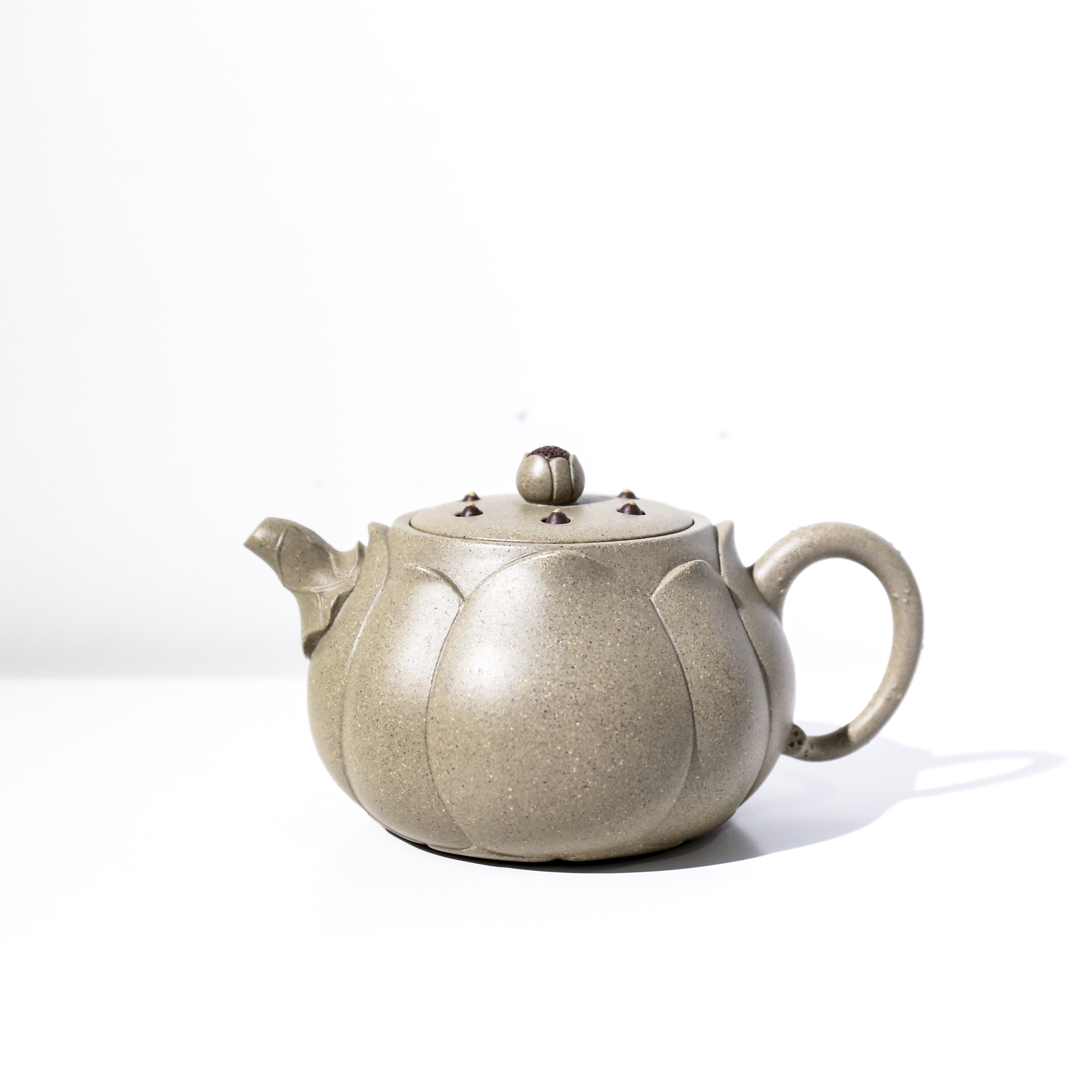 《新姿》一壺設(shè)計(jì)于丁酉早春,設(shè)計(jì)的靈感來(lái)源于一盆案頭水仙。“幽姿冉冉弄晴煙,玉蕤暈碧曉肌鮮。”作品精選黃龍山原礦紅降坡泥料,泥料色澤紅潤(rùn),油脂極好。制作時(shí)充分考慮三維一體的空間理念,作品的每一個(gè)視角都力求把握線條的美感與整體的協(xié)調(diào)性。壺身部分的線條則緩沖流暢,于明暗轉(zhuǎn)折、虛實(shí)對(duì)比中凸顯出此壺的溫潤(rùn)、凝重、古雅之風(fēng)。